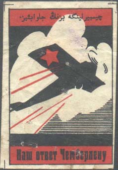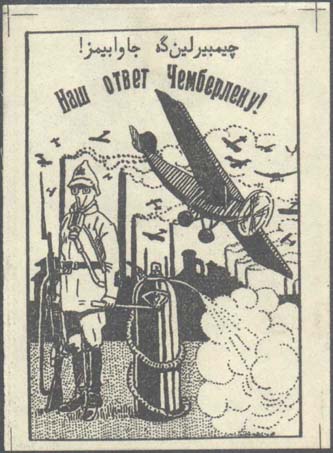 1927 1927 г. Разм. рамки 45 х 68 мм. Одноцветная печать на белой бумаге. В прямоугольной рамке в центре красноармеец в противогазе рядом с баллоном с отравляющим веществом на фоне завода. В небе самолеты. Сверху текст на татарском языке арабским шрифтом. Ниже полукругом текст: «Наш ответ Чемберлену!».
