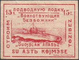 1930 1930(?) г. Разм. рамки 39 х 24 мм. Одноцветная печать на сероватой бумаге. В прямоугольной рамке в центре подводная лодка в надводном положении. Слева и сверху текст: «Строим подводную лодку «Воинствующий Безбожник»» и номинал. Справа и внизу текст на татарском языке латинским шрифтом и номинал. В правом нижнем углу выходные данные мелким шрифтом неразборчиво.