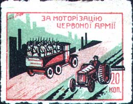 1932 1932 г. Разм. рамки 38,5 х 29 мм. Трехцветная печать на белой бумаге. В центре в прямоугольной рамке дорога, по которой едут грузовик с солдатами в кузове и трактор. Слева индустриальный пейзаж. Справа внизу номинал.