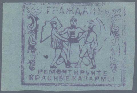 1925 1925(?) г. Разм. рамки 61 х 50 мм. Одноцветная печать низкого качества на зеленовато-серой бумаге. На лицевой стороне фиолетовый оттиск ручного штампа. В двойной прямоугольной рамке в центре рабочий, крестьянин и солдат на фоне серпа и молота. Текст в три строки: «Граждане! Ремонтируйте красные казармы». Слева и справа с внутренней стороны рамки декоративные элементы.
