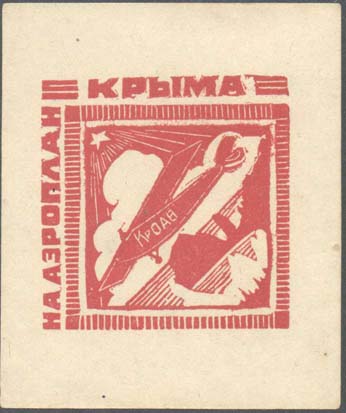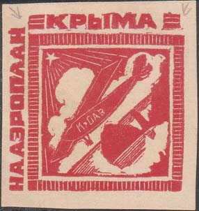 1924 1924(?) г. Разм. 57 х 69 мм. Одноцветная печать на белой бумаге. В рамке самолет «Кр.ОАВ» над берегом моря. Сверху пятиконечная звезда с лучами. Текст: «На аэроплан Крыма».