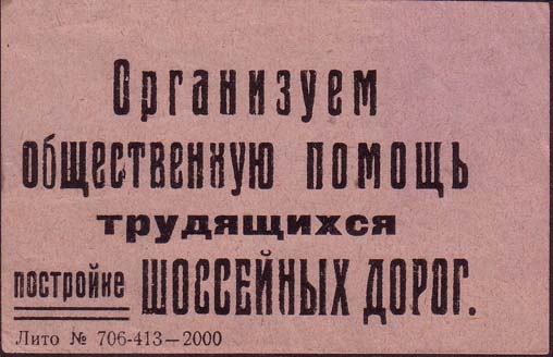 1928 1928 г. 08.11.1928 г. Разм. 85 х 55 мм. Одноцветная печать на бумаге различных цветов. В центре текст в четыре строки: «Организуем общественную помощь трудящихся постройке шоссейных дорог». Слева внизу мелким шрифтом выходные данные: «Лито № 706-413-2000».