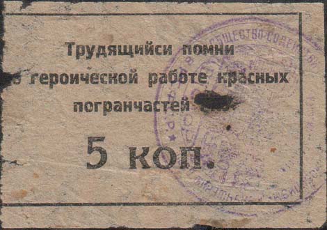 1928 1928(?) г. Листок из квитанционной книжки разм. рамки 76 х 45 мм. Одноцветная печать на тонкой серо-зеленой бумаге. Левосторонняя просечка 11 1/2. В центре текст в четыре строки: «Трудящийся, помни о героической работе красных погранчастей». Ниже номинал. На лицевой стороне фиолетовый оттиск круглой контрольной печати диаметром 46 мм с неразборчивым текстом.