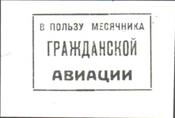 1930 1930(?) г. Разм. рамки 37 х 23 мм. Одноцветная печать на белой бумаге. В рамке текст в три строки: «В пользу месячника гражданской авиации».