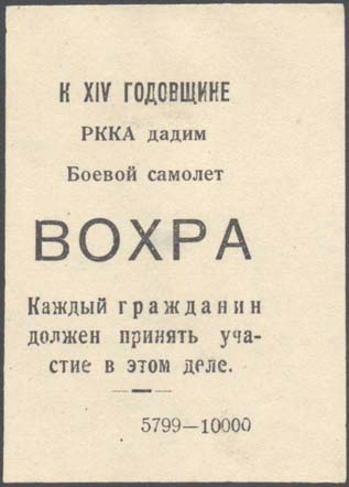 1932 1932(?) г. Разм. 56 х 77 мм. Одноцветная печать на белой бумаге. Текст в семь строк: «К XIV годовщине РККА дадим боевой самолет ВОХРА. Каждый гражданин должен принять участие в этом деле». Внизу мелким шрифтом выходные данные: «5799-10000».