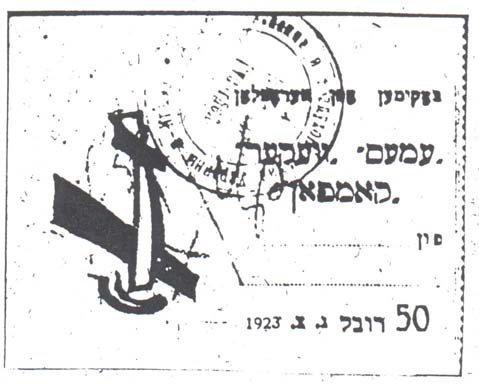 1923 1923 г. Областной выпуск. Листок из квитанционной книжки разм. 78 х 61 мм. Одноцветная печать на тонкой серовато-зеленой бумаге. Нерегулярная правосторонняя зубц. Самолет-моноплан, летящий вниз, справа текст на идише в четыре строки. Сверху фиолетовый оттиск контрольной печати Киевского губотдела Общества авиации и воздухоплавания Украины и Крыма.