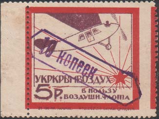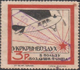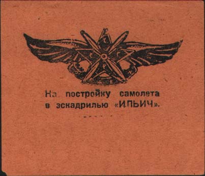1923 1923 г. Двухцветная печать на белой бумаге. В центре на фоне крупной цифры номинала в декоративной рамке самолет-биплан, снижающийся влево. Сверху серп и молот. В центре текст в три строки: «У.С.С.Р. На создание Красного Воздушного Флота Крем[енчугского]. Отд[еления]. О-ва Авиации и воздухоплавания». Под рамкой выходные данные: «Гос. образц. типолит. «Кремпечать».