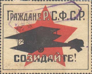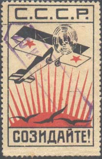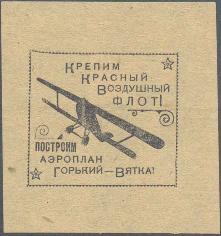 1933 1933(?) г. Разм. 50 х 45 мм. Одноцветная печать на желтой бумаге. В прямоугольной рамке самолет-биплан, летящий влево вверх. В правом верхнем углу пятиконечная звезда и текст в четыре строки: «Крепим Красный Воздушный флот!». В левом нижнем углу пятиконечная звезда и текст в три строки: «Построим аэроплан Горький – Вятка!».