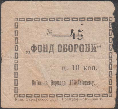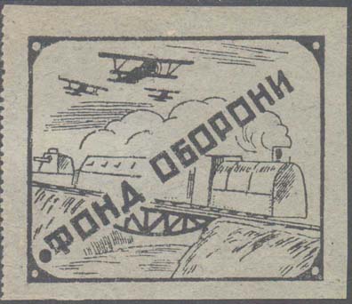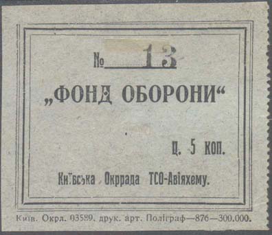 1927 1927 г. Одноцветная двухсторонняя печать на бумаге различных цветов. На лицевой стороне в рамке 56 х 46 мм бронепоезд, идущий по мосту, в небе самолеты и текст по диагонали на украинском языке: «Фонд обороны». На оборотной стороне в центре текст: ««Фонд обороны»». Сверху номер нумератором. Внизу номинал и текст: «Киевский Окрсовет ОСО-Авиахима». Внизу под рамкой выходные данные: «Киев. Окр. 03589 тип. арт. полиграф - 876 - 300000».