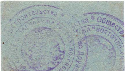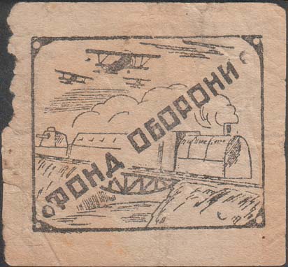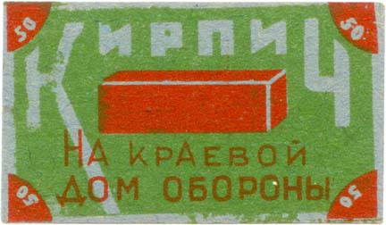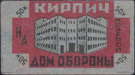 1930 1930(?) г. Разм. 54 х 30 мм. Двухцветная печать на серо-зеленоватой бумаге. В центре различные рисунки. Текст: «Кирпич на краевой дом обороны». По углам номинал. На обороте фиолетовый оттиск круглой контрольной печати с неразборчивым текстом.