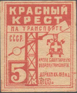 1931 1931 г. Разм. рамки 40 х 50 мм. Одноцветная печать на желтоватой бумаге. В центре механический светофор. Справа в центре паровоз, скрещенные якорь, топор и красный крест. Слева внизу номинал. Сверху текст в четыре строки: «Красный Крест на транспорте СССР». Справа внизу текст в три строки: «Крепи санитарную оборону транспорта. Дорком К.К. Ю-З ж.д.».