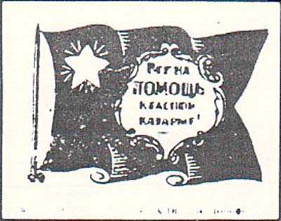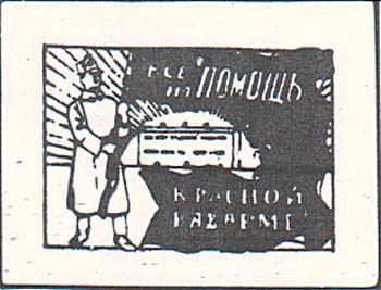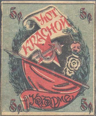 1923 1923 г. Разм. рамки 55 х 66 мм. Трехцветная печать на белой бумаге. В центре в обрамлении венка пятиконечная звезда, серп и молот. Ниже красное знамя. Текст: «Уют красной казарме». Во внутренних углах рамки номинал.