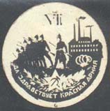 1925 1925 г. Круг диаметром 26 мм. Одноцветная печать на плотной белой бумаге с лаковым покрытием. В центре слева отряд красноармейцев с винтовками. Справа завод и аббревиатура «СССР». Сверху римская цифра «VII». Внизу на фоне венка пятиконечная звезда с серпом и молотом. Ниже полукругом текст: «Да здравствует Красная армия».