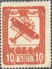 1924 1924 г. Разм. рамки 24 х 32,5 мм. Одноцветная печать на белой бумаге. Зубц. 11 1/2. С клеем. В широкой декоративной рамке самолет-биплан. Вокруг самолета текст: «Красный Костромич». Сверху эмблема ОДВФ. Внизу аббревиатура «К.О.Д.В.Ф.» и номинал в золотой валюте.