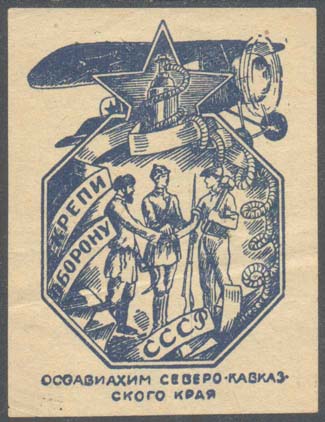 1930 1930(?) г. Разм. 53 х 71 мм. Одноцветная печать на желтоватой бумаге. В центре в восьмиугольной рамке рабочий, крестьянин и красноармеец пожимают друг другу руки. Сверху самолет-биплан, пятиконечная звезда, баллон с газом и лента. На ленте текст: «Крепи оборону СССР». Внизу текст в три строки: «Осоавиахим Северо-Кавказского Края».