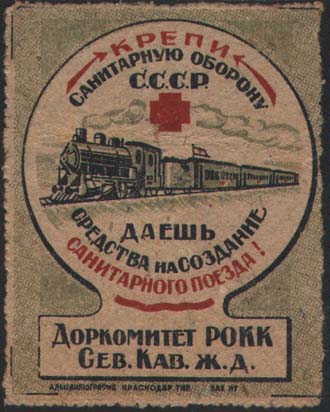 1932 1932 г. Разм. 53 х 68 мм. Трехцветная печать на сероватой рыхлой бумаге низкого качества. В центре круглая рамка диаметром 50 мм, переходящая внизу в прямоугольную рамку. В круглой рамке в центре санитарный поезд. Выше красный крест. Сверху полукругом текст в три строки: «Крепи санитарную оборону С.С.С.Р.». Внизу полукругом текст в три строки: «Даешь средства на создание санитарного поезда!». Внизу в прямоугольной рамке текст в три строки: «Доркомитет РОКК Сев[еро]. Кав[казской]. ж. д.». Внизу мелким шрифтом выходные данные: «Адыглитография. Краснодар. Тир. Зак №7».