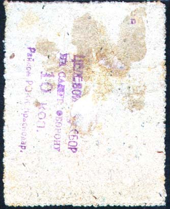 1932 1932 г. Фиолетовая надпечатка текста в четыре строки: «Целевой сбор на санит[арную]. оборону 10 коп. Райком РОКК Краснодар» на оборотной стороне знака предыдущего выпуска.