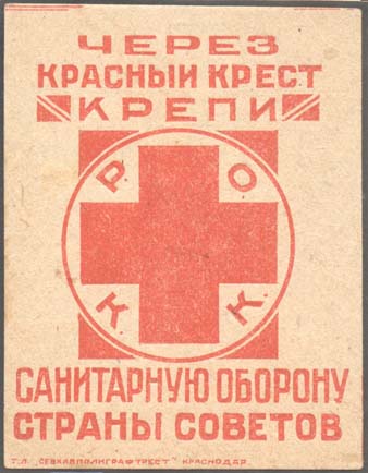 1930 1930(?) г. Разм. 56 х 72 мм. Одноцветная печать на желто-серой бумаге. В центре в круглой рамке диаметром 36 мм красный крест о аббревиатура «Р.О.К.К.». Cверху текст в три строки: «Через Красный Крест крепи». Внизу продолжение текста в две строки: «Cанитарную оборону Страны Советов». Внизу мелким шрифтом выходные данные: «Т.Л. «Севкавполиграфтрест» Краснодар».