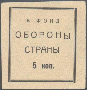 1930 1930 г. Разм. 62 х 63 мм. Одноцветная печать на бумаге различных цветов. В двойной прямоугольной рамке разм. 48,5 х 53,5 мм в центре текст в три строки: «В фонд обороны страны». Ниже номинал.