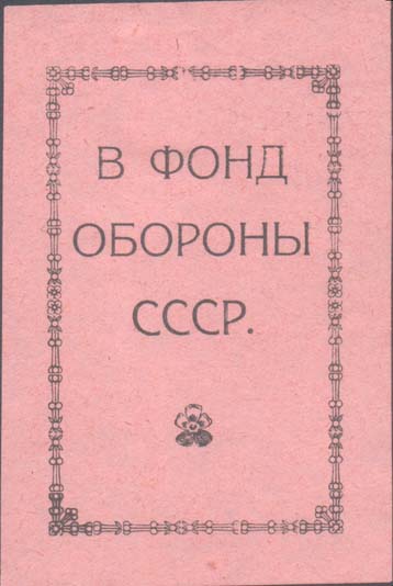 1930 1930 г. Разм. 60 х 90 мм. Одноцветная печать на розовой бумаге. В центре в прямоугольной рамке разм. 45 х 72 мм из различных декоративных элементов текст в три строки: «В фонд обороны СССР». Внизу декоративный элемент в виде цветка.