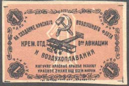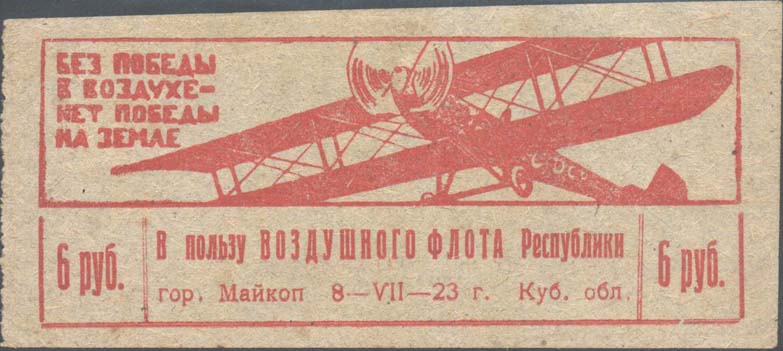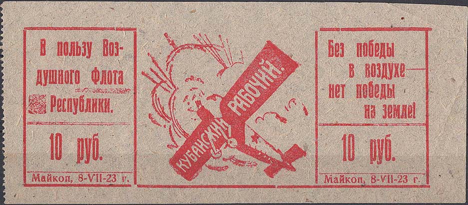 1923 1923 г. Листок из квитанционной книжки разм. рамки 118 х 48 мм. Одноцветная печать на серовато-голубой бумаге. Нерегулярная левосторонняя зубц. В прямоугольной рамке самолет-биплан, летящий влево. В левом верхнем углу текст в четыре строки: «Без победы в воздухе нет победы на земле». Внизу текст в две строки: «В пользу Воздушного флота Республики гор. Майкоп 8-VII-23 г. Куб[анская]. Обл[асть].». Внизу по углам номинал.
