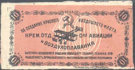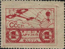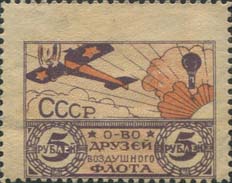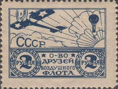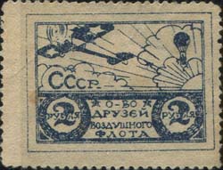 1923 1923 г. Первый всесоюзный выпуск. Разм. рамки 33 х 23 мм. Одноцветная и двухцветная печать на плотной белой бумаге. Зубц. 11 1/2. В двойной рамке на фоне облаков самолет-моноплан, справа воздушный шар. Под самолетом аббревиатура «СССР». В нижней части рисунка текст в четыре строки: «О-во друзей Воздушного Флота». По бокам в венках из листьев номинал.