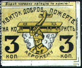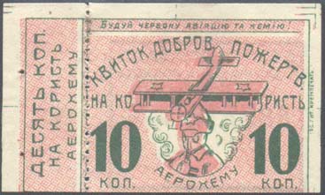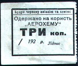 1926 1926 г. Листок из квитанционной книжки. Двухсторонняя двухцветная печать на белой бумаге. Лево-сторонняя зубц. 11 1/2. На лицевой стороне в рамке 43 х 33 мм в центре самолет-биплан и красноармеец в противогазе на фоне клубов дыма. Сверху текст на украинском языке: «Создавай красную авиацию и химию!» В центре текст на украинском языке в три строки: «Квитанция Добров[ольного]. Пожертвов[ания]. в пользу Авиахима». Внизу по углам номинал. Слева с наружной стороны рамки выходные данные на украинском языке мелким шрифтом: «Гос. Лит. Кремпечать». На оборотной стороне в рамке 37 х 23 мм в центре текст на украинском языке в пять строк: «Получено в пользу «Авиахима»... коп... 192... г. Подпись...». Сверху текст на украинском языке: «Создавай красную авиацию и химию!». На талоне вертикально текст на украинском языке в три строки: «... коп. в пользу Авиахима».