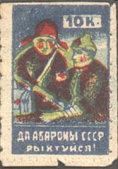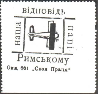 1926 1926(?) г. Разм. 52 х 49 мм. Одноцветная печать на светло-коричневой бумаге. В центре в прямоугольной рамке самолет-биплан. По периметру текст на украинском языке: «Наш ответ Папе Римскому». Внизу мелким шрифтом выходные данные на украинском языке: «Окл. 601 «Свой труд»».