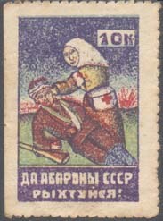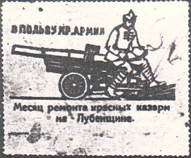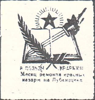 1923 1923 г. Одноцветная печать на желтоватой бумаге. Зубц. 11 1/2 низкого качества. В центре различные рисунки. Текст в три строки: «В пользу Кр[асной]. Армии. Месяц ремонта красных казарм на Лубенщине».