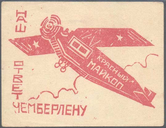 1927 1927 г. Разм. 86 х 68 мм. Одноцветная печать на желтой бумаге. В центре самолет «Красный Майкоп», летящий влево вверх на фоне облаков. Слева и внизу текст: «Наш ответ Чемберлену».