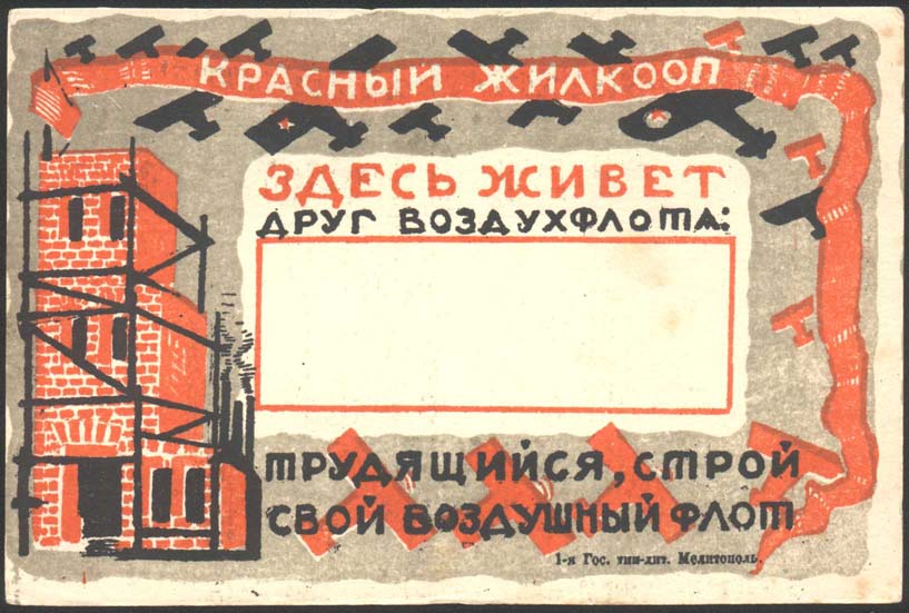 1927 1927 г. Листок разм. 136 х 90 мм. Трехцветная печать на толстой белой бумаге. В центре прямоугольная рамка разм. 73 х 22 мм с белым полем для фамилии, вписывавшейся от руки. Слева строящееся кирпичное здание в лесах. Сверху и справа лента на фоне летящих самолетов. Сверху на ленте текст: «Красный жилкооп». Ниже текст в две строки: «Здесь живет друг воздухфлота». Внизу текст в две строки: «Трудящийся, строй свой воздушный флот». Справа внизу мелким шрифтом выходные данные: «1-я гос. тип-лит. Мелитополь».