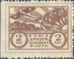 1924 1924 г. Республиканский выпуск. Разм. рамки 36 х 27 мм. Одноцветная печать на белой бумаге. Зубц. 11 1/2. С клеем. В двойной прямоугольной рамке на фоне облаков самолет-моноплан, справа воздушный шар. Под самолетом аббревиатура «БССР». В нижней части рисунка текст в четыре строки «О-во друзей Воздушного Флота». По бокам в венках из листьев номинал.