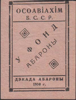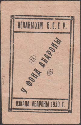 1930 1930 г. Разм. 44 х 61 мм. Одноцветная печать на светло-розовой бумаге. В двойной рамке в центре по диагонали текст на белорусском языке: «В фонд обороны» и декоративные элементы. Сверху текст в две строки на белорусском языке: «ОСОАВИАХИМ Б.С.С.Р.». Внизу текст в две строки на белорусском языке: «Декада обороны 1930 г.».