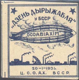 1931 1931 г. 20.01.1931 г. 1931 г. (20.01.1931 г.). Республиканский выпуск. Разм. рамки 46 х 46 мм. Одноцветная печать на белой бумаге. В двойной рамке дирижабль «Осоавиахим» в облаках над заводами. Сверху текст в две строки: ««День дирижабля» в БССР». Внизу текст в две строки: «20-1-1931. Ц.С.О.А.Х. БССР». По углам знака разграничительные линии.