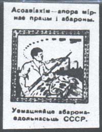 1932 1932(?) г. Разм. 39 х 52 мм. Одноцветная печать на желтоватой бумаге. В центре в прямоугольной рамке разм. 31 х 29 мм рабочий с винтовкой на фоне аграрно-индустриального пейзажа. В небе вереница самолетов. Сверху над рамкой текст в две строки на белорусском языке: «Осоавиахим – опора мирного труда и обороны». Внизу под рамкой текст в две строки: «Укрепляйте обороноспособность СССР».