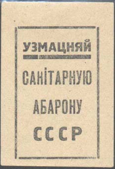 1930 1930(?) г. Разм. рамки 29 х 45 мм. Одноцветная печать на сероватой бумаге. В прямоугольной рамке текст в четыре строки на белорусском языке: «Крепи санитарную оборону СССР».