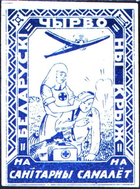 1930 1930(?) г. Разм. рамки 45 х 60 мм. Одноцветная печать на белой бумаге. В декоративной рамке в центре медсестра перевязывает голову раненому красно-армейцу на фоне разрыва снаряда. Сверху санитарный самолет. По внутреннему периметру рамки текст на белорусском языке: «На санитарный самолет «Белорусский красный крест».