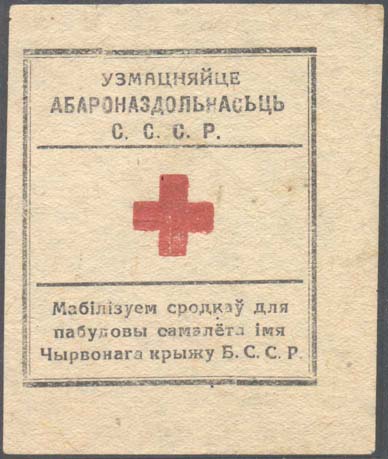 1930 1930(?) г. Разм. рамки 49 х 57 мм. Двухцветная печать на желтоватой бумаге. В прямоугольной рамке в центре между двух горизонтальных линий красный крест. Сверху текст на белорусском языке в три строки: «Укрепляй обороноспособность С.С.С.Р.». Внизу текст на белорусском языке в три строки: «Мобилизуем средства для постройки самолета имени Красного креста Б.С.С.Р.».