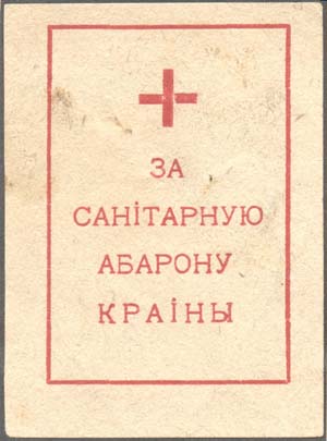 1930 1930(?) г. Разм. 49 х 67 мм. Одноцветная печать на желтоватой бумаге. В прямоугольной рамке разм. 37 х 55 мм сверху красный крест. Ниже текст в четыре строки на белорусском языке: «За санитарную оборону страны».