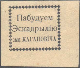 1926 1926(?) г. Разм. рамки 36 х 32 мм. Одноцветная печать на желтой бумаге. В рамке из ромбиков текст в три строки на белорусском языке: «Построим эскадрилью им. Кагановича».