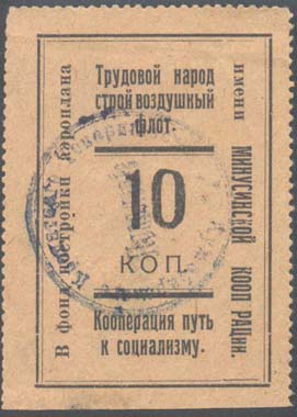 1924 1924(?) г. Разм. рамки 36 х 54 мм. Одноцветная печать на розовой (оттенки) бумаге. Зубц. 11 1/2. В двойной прямоугольной рамке в центре номинал. Сверху текст в три строки: «Трудовой народ строй воздушный флот». Внизу текст в две строки: «Кооперация путь к социализму». Слева вертикально снизу вверх текст: «В фонд постройки аэроплана». Справа вертикально сверху вниз продолжение текста: «Имени Минусинской Кооперации». На лицевой стороне фиолетовый оттиск круглой контрольной печати диаметром 32 мм с неразборчивым текстом.