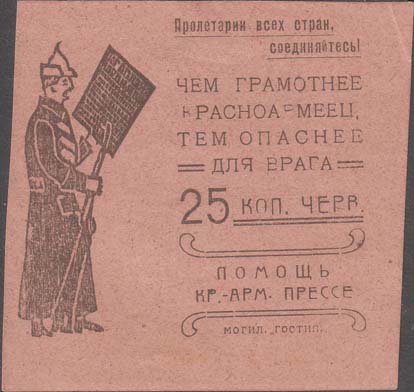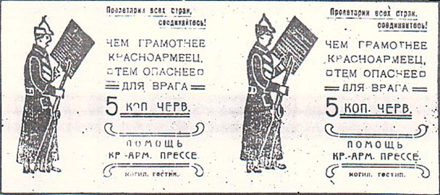 1924 1924 г. Разм. 68 х 66 мм. Одноцветная печать на бумаге различных цветов. Слева красноармеец с винтовкой, читающий газету. Справа в центре номинал. Справа сверху текст в шесть строк: «Пролетарии всех стран, соединяйтесь! Чем грамотнее красноармеец, тем опаснее для врага». Справа внизу под номиналом текст в две строки: «Помощь Кр[асно].-Арм[ейской]. прессе» и декоративные элементы. Справа внизу мелким шрифтом выходные данные: «Могил. Гостип».