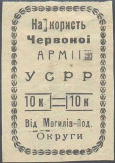 1924 1924 г. Разм. рамки 31 х 49 мм. Одноцветная печать на белой бумаге. В рамке с закругленными краями из декоративных растительных элементов сверху текст в четыре строки: «В пользу Красной Армии. УССР». Ниже номинал. Внизу текст в две строки на украинском языке: «От Могилев-Под[ольского] округа».