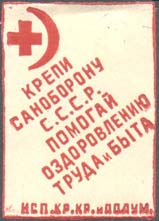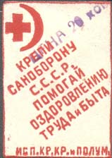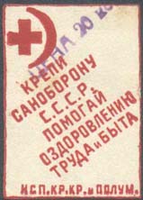 1932 1932 г. Разм. 25 х 36 мм. Одноцветная печать на белой бумаге. В левом верхнем углу красный крест и красный полумесяц. В центре по диагонали текст в шесть строк: «Крепи саноборону С.С.С.Р. Помогай оздоровлению труда и быта». Внизу текст: «Исп[олком]. Кр[асного]. Кр[еста]. и полум[есяца].».