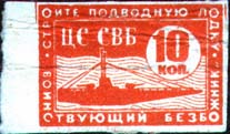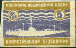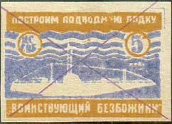 1931 1931 г. Разм. рамки 33 х 23 мм. Одноцветная печать на желтоватой бумаге. В центре подводная лодка в надводном положении на фоне порта. Сверху справа наклонно текст в четыре строки: «Построим подводную лодку «Воинствующий Безбожник»». Слева номинал и аббревиатура «ЦС СВБ».