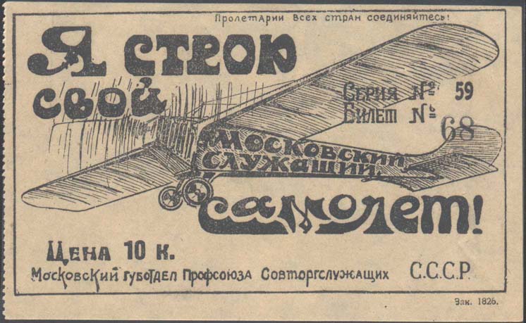 1930 1930(?) г. Листок из квитанционной книжки разм. рамки 117 х 67 мм. Левосторонняя зубц. 11 1/2. Од-ноцветная печать на желтоватой бумаге. В центре в прямоугольной рамке самолет «Московский служащий». Текст в шесть строк: «Пролетарии всех стран соединяйтесь! Я строю свой самолет. Серия №.. Билет № ..Цена ... к. Московский Губотдел Профсоюза Совторгслужащих С.С.С.Р.». Внизу под рамкой справа мелким шрифтом выходные данные: «Зак. 1826».