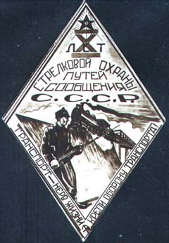 1932 1932 г. Ромб разм. 39 х 57 мм. Одноцветная печать на фотобумаге. В рамке в форме ромба в центре часовой у железнодорожного моста с идущим поездом. Сверху текст в пять строк: «Х лет стрелковой охраны путей сообщения С.С.С.Р.». Внизу по внутренней стороне рамки текст: «Транспорт – нерв жизни. Крепи оборону транспорта!».