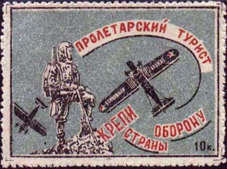 1932 1932 г. Разм. рамки 50 х 30 м. Трехцветная печать на белой бумаге. Нерегулярная зубц. В рамке аль-пинист на вершине горы. В небе два самолета-биплана. На крыльях одного из самолетов текст: «Северный Кавказ». Текст в четыре строки по окружности: «Пролетарский турист, крепи оборону страны». В правом нижнем углу номинал.
