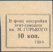 1933 1933 г. 17.011933 г. Разм. рамки 31 х 24 мм. Одноцветная печать на желтоватой бумаге. В двойной прямоугольной рамке сверху текст в три строки: «В фонд постройки агитсамолета им. М.Горького» В центре номинал. В правом нижнем углу аббревиатура «ГДКА».