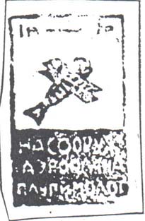 1923 1923 г. Разм. рамки 27 х 46 мм. Одноцветная печать низкого качества на тонкой полупрозрачной бумаге. В прямоугольной рамке сверху самолет-биплан, летящий вправо вверх. Внизу текст в три строки: «На сооружение аэроплана «Плуг и молот»».